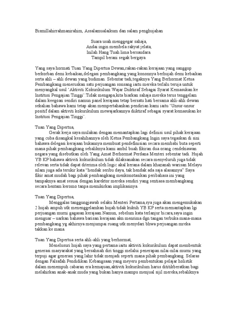 Assalammualaikum dan salam sejahtera saya ucapkan buat Tuan. Baik Buruk Kegiatan Kokurikulum. Teks Perdana Menteri Upih pinang seludang kelapa Kicauan burung di balik pohonan Salam sejahtera pembuka bicara Gelanggang debat saya mulakan.